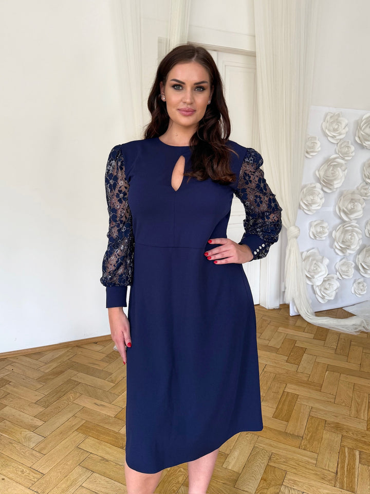 Elegantní krátké šaty v tmavě modré barvě zaujmou svým ženským a rafinovaným stylem. Rukávy jsou z krajky, která dodává šatům nádech romantiky. Ve výstřihu je decentní slza, která působí svůdně, ale stále elegantně. Šaty mají skvělý střih, který dělá krásnou postavu, a jsou ideální volbou pro společenské události, večírky či slavnostní příležitosti.
