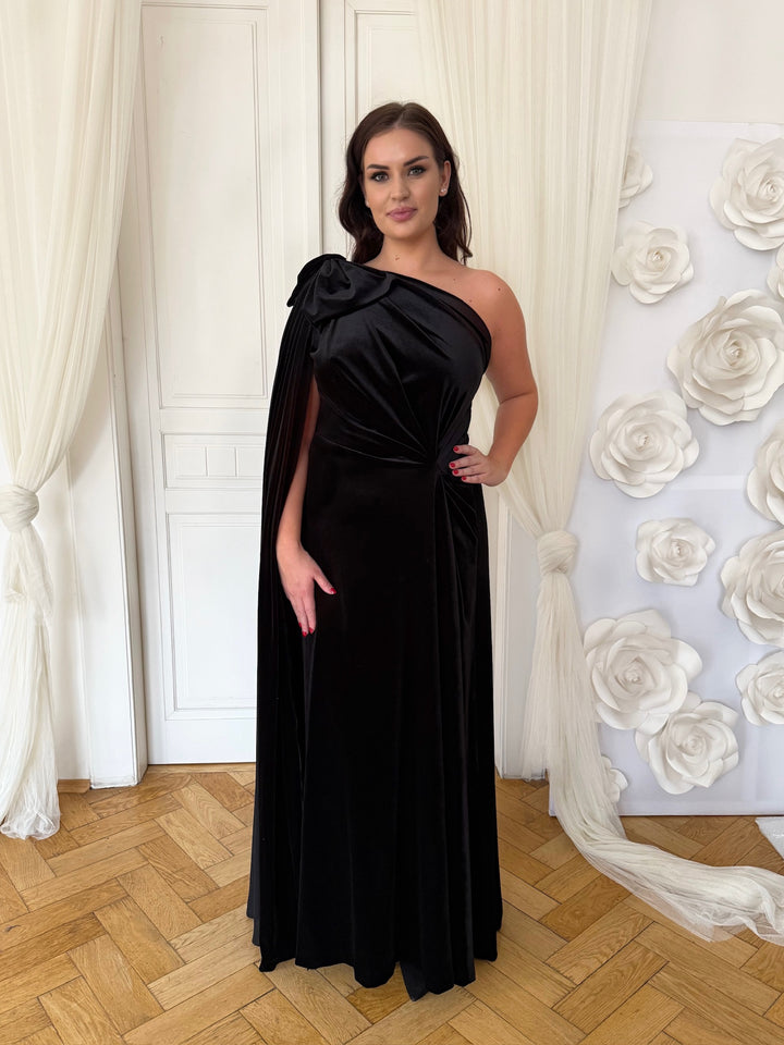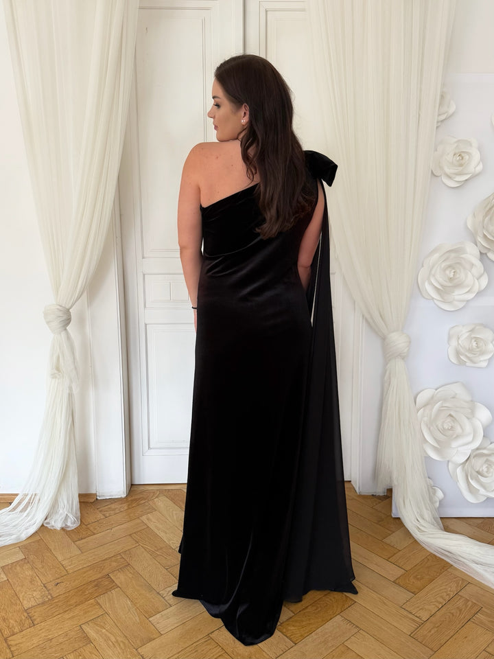 Luxusní měkký samet se krásně leskne a jemně obepíná postavu, zatímco asymetrický střih s mašlí na rameni dodává šatům výjimečný půvab.