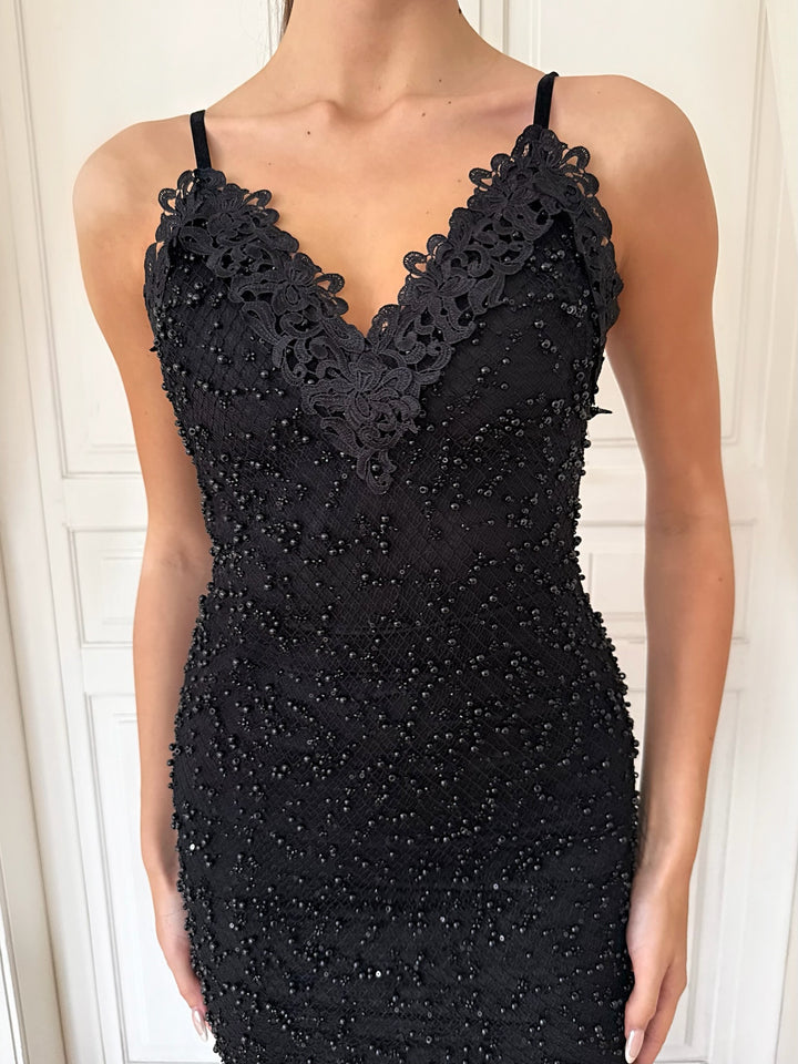 Tyto luxusní dlouhé večerní šaty v černé barvě vynikají svou sofistikovaností a nadčasovostí. Jsou zdobené jemnými korálky po celé ploše, které dodávají modelu třpytivý efekt a výjimečný vzhled při každém pohybu.