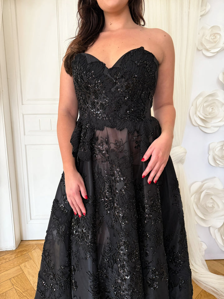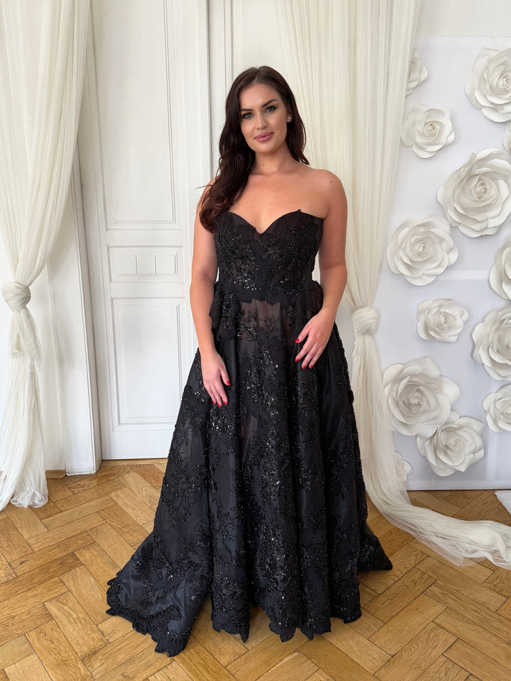 Tyto exkluzivní černé večerní šaty zaujmou na první pohled svým korzetovým střihem a precizním krajkovým zdobením.