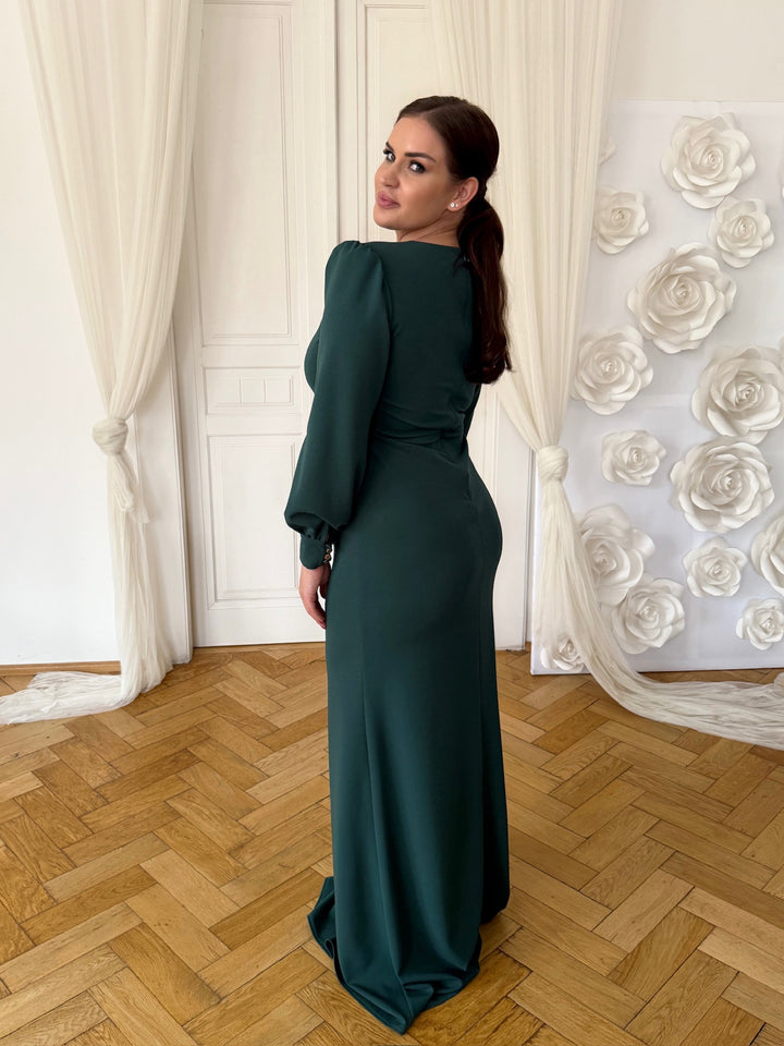 Okouzlující dlouhé společenské šaty v hlubokém smaragdově zeleném odstínu zaujmou svou jednoduchou elegancí a ženským střihem. Mají jemně vypasovaný střih, který krásně zvýrazní siluetu, a drobný průstřih u dekoltu pro decentní, ale rafinovaný detail.